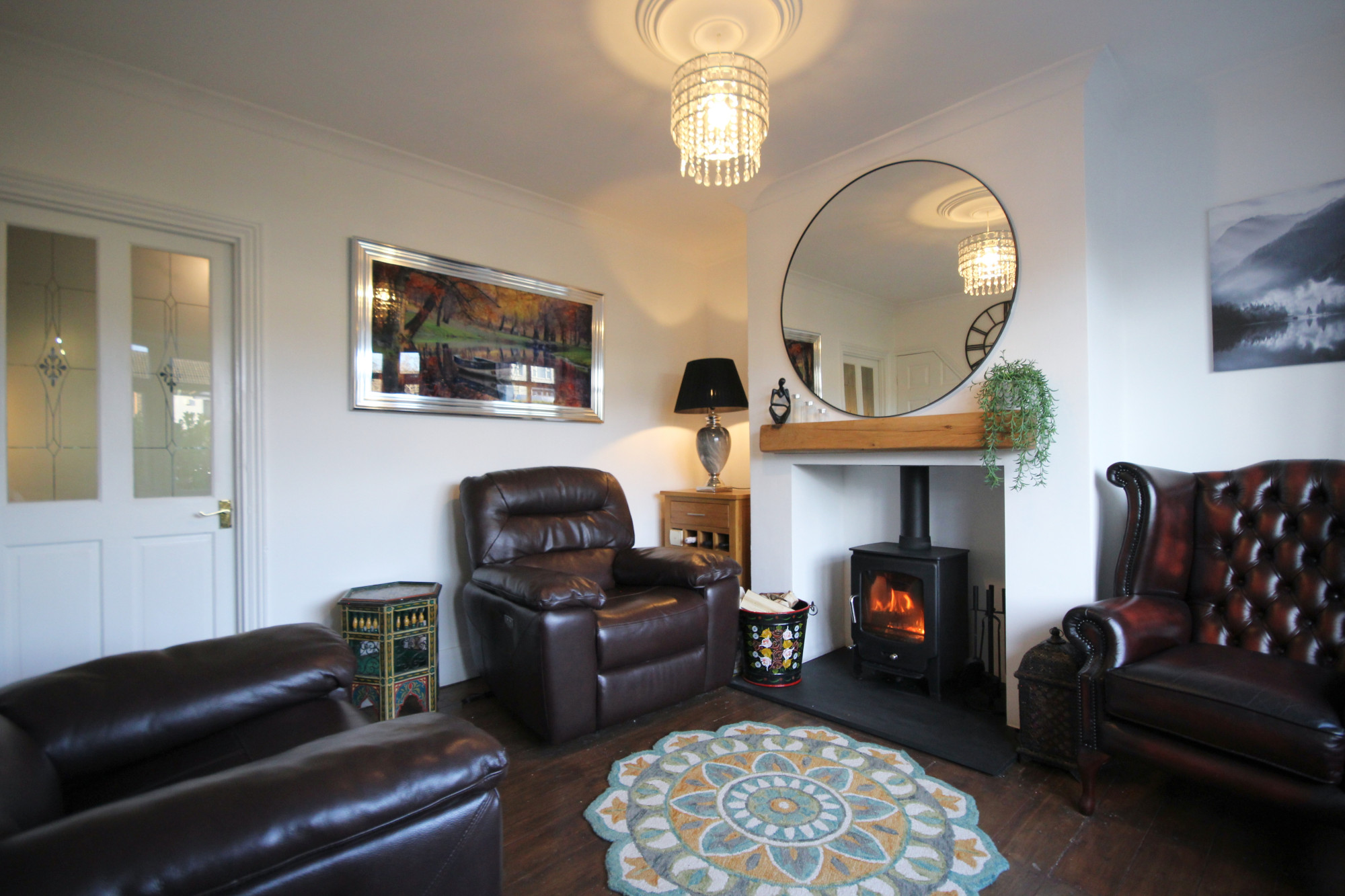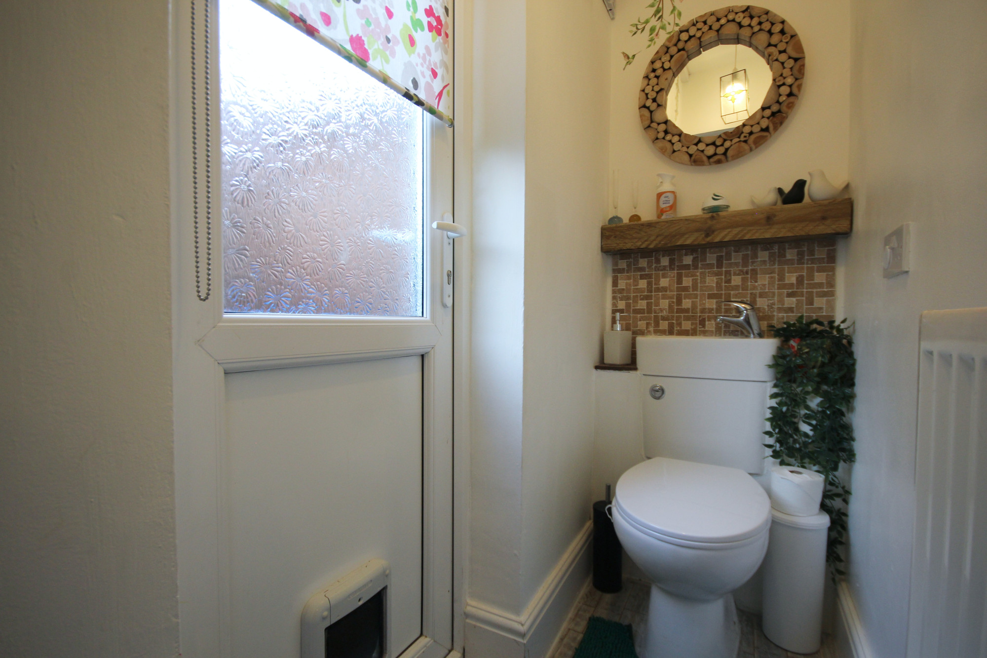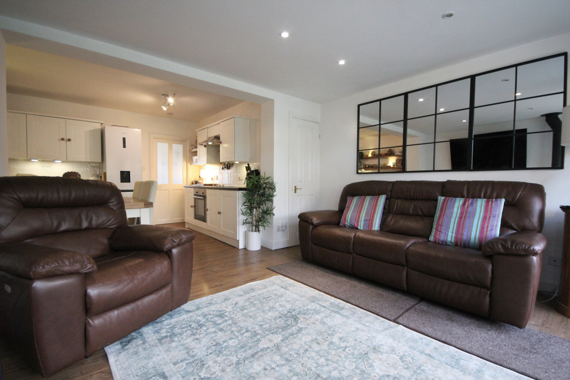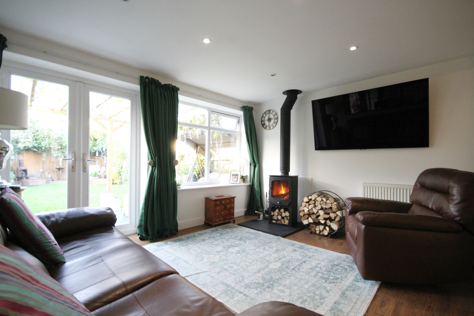 Step inside to a compact yet welcoming hallway, setting the tone for the calm, well-kept interiors. To the front is the cosy lounge, a wonderfully inviting space centred around a wood-burning stove—perfect for fireside evenings and relaxed weekends. Beyond, the house opens into a surprisingly spacious reception kitchen, a superb family and entertaining zone with generous work surfaces, dining space, and French doors spilling out onto the rear garden. A handy ground-floor W.C. adds additional practicality.