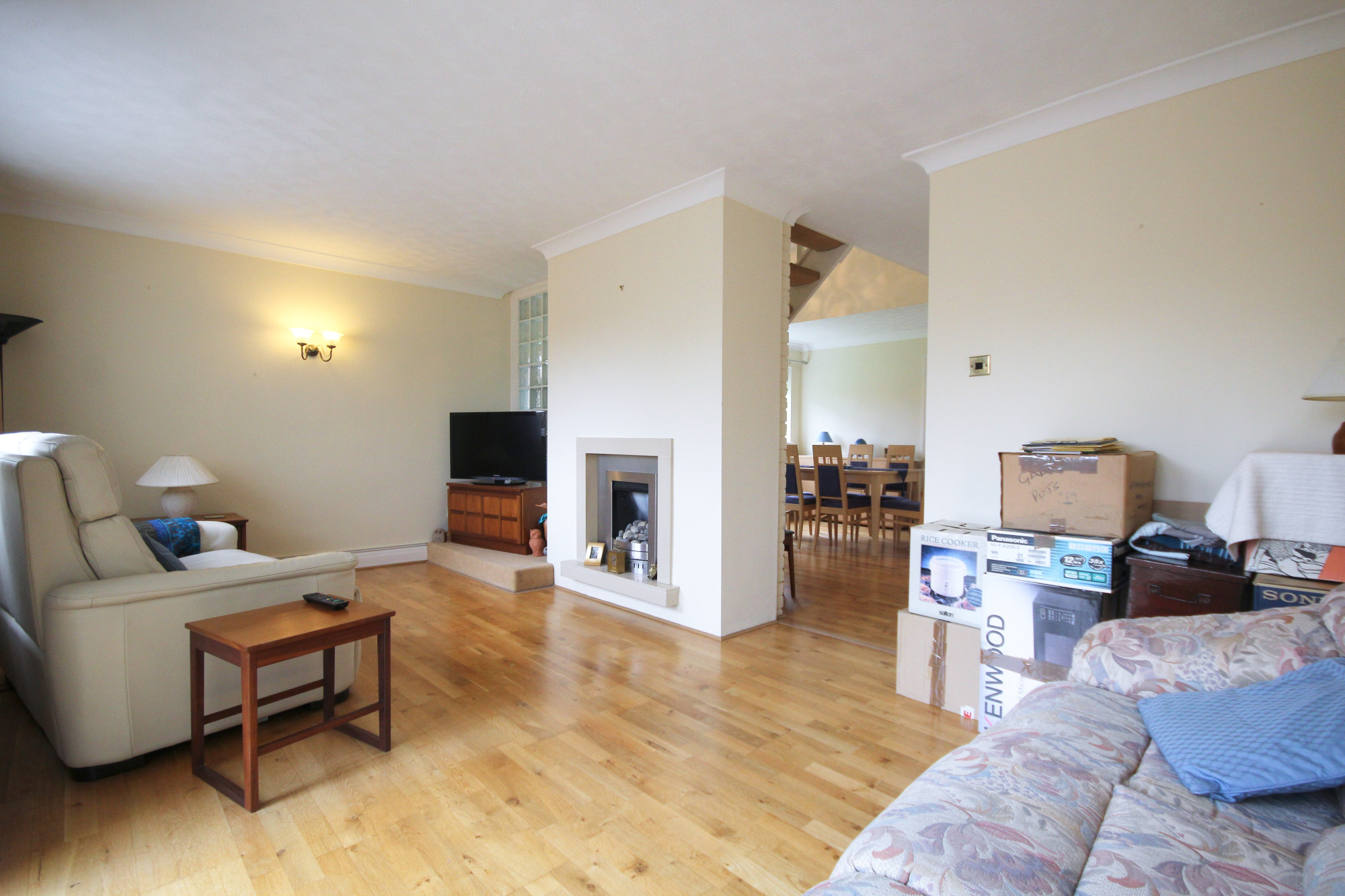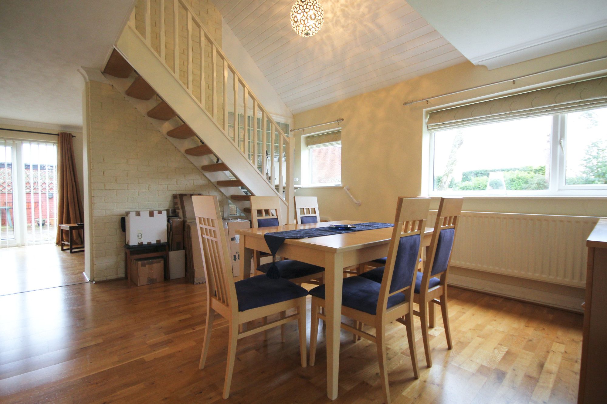 This particular property stands out with its lovely outlook over a small green to the front and its light‑filled, open‑plan ground floor. The entrance hallway features an attractive glass‑brick wall creating a striking connection to the dining room. This impressive central space is the heart of the home, boasting a vaulted ceiling and a gallery landing above.
