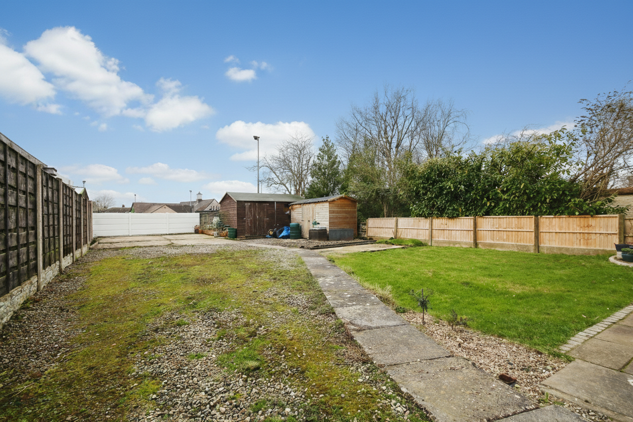 Externally, the property enjoys a particularly generous south-westerly plot, allowing sunlight to pour across the garden throughout the afternoon and evening. The outdoor space offers excellent scope for landscaping, presenting an exciting blank canvas to create a superb family garden or entertaining area. A large driveway provides ample off-road parking, while two substantial storage sheds offer practical solutions for hobbies, tools, or additional storage.