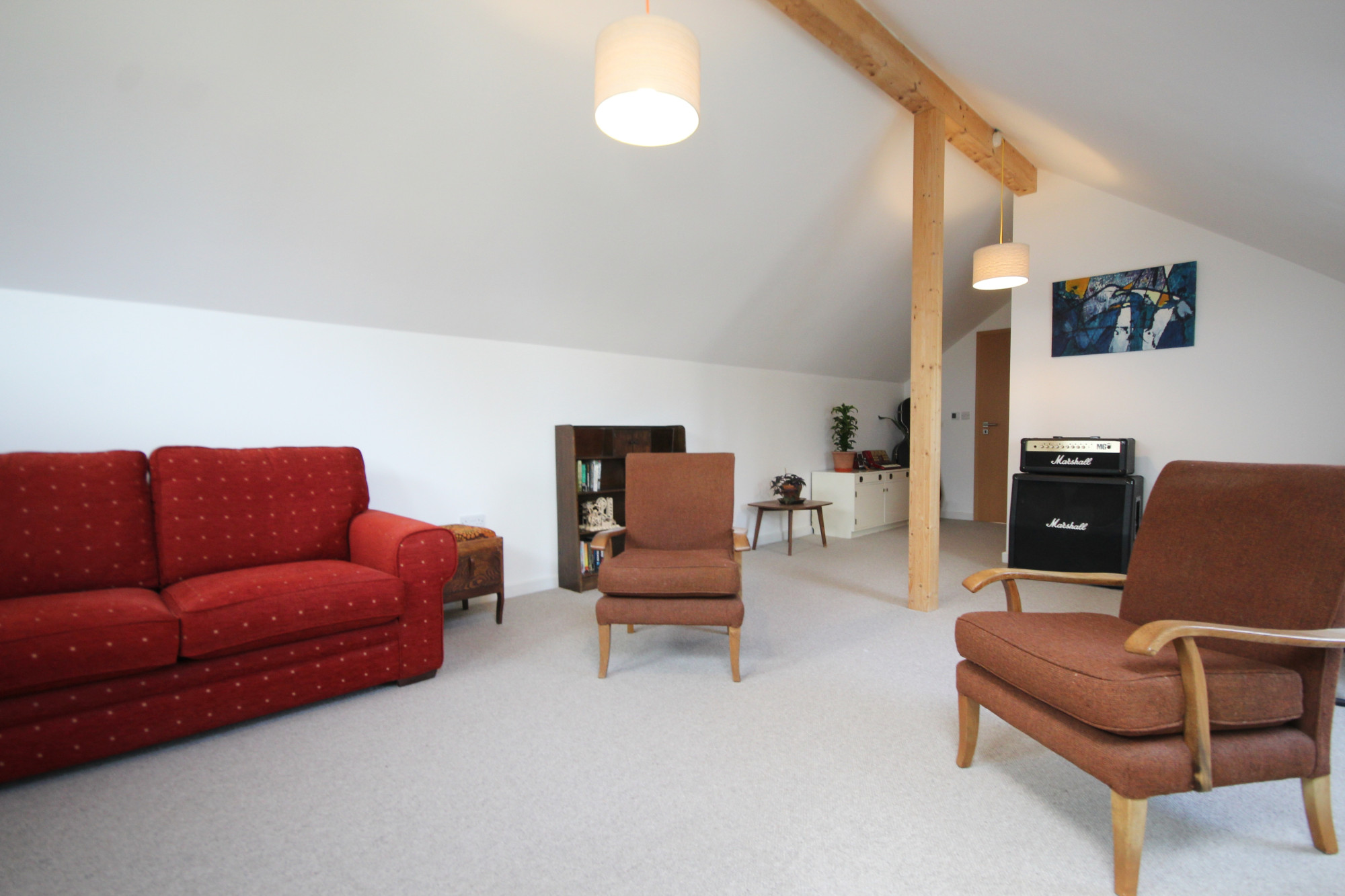 The upper first floor is reserved for the principal suite - an extraordinary sanctuary. Here, a vaulted ceiling with a dramatic glazed apex floods the space with natural light, while a full-width balcony offers tranquil views across the surrounding greenery. A sleek, contemporary en-suite completes this luxurious retreat.