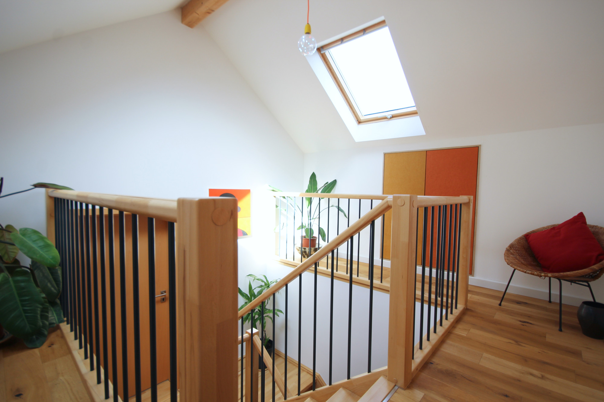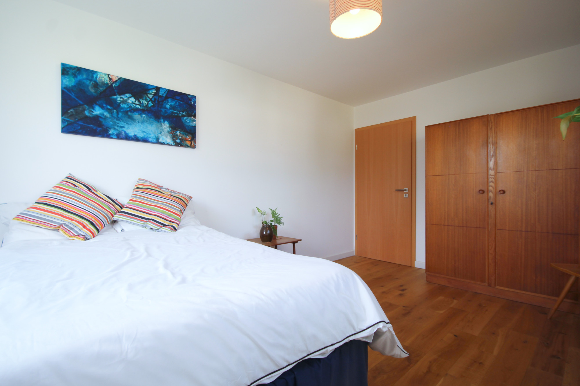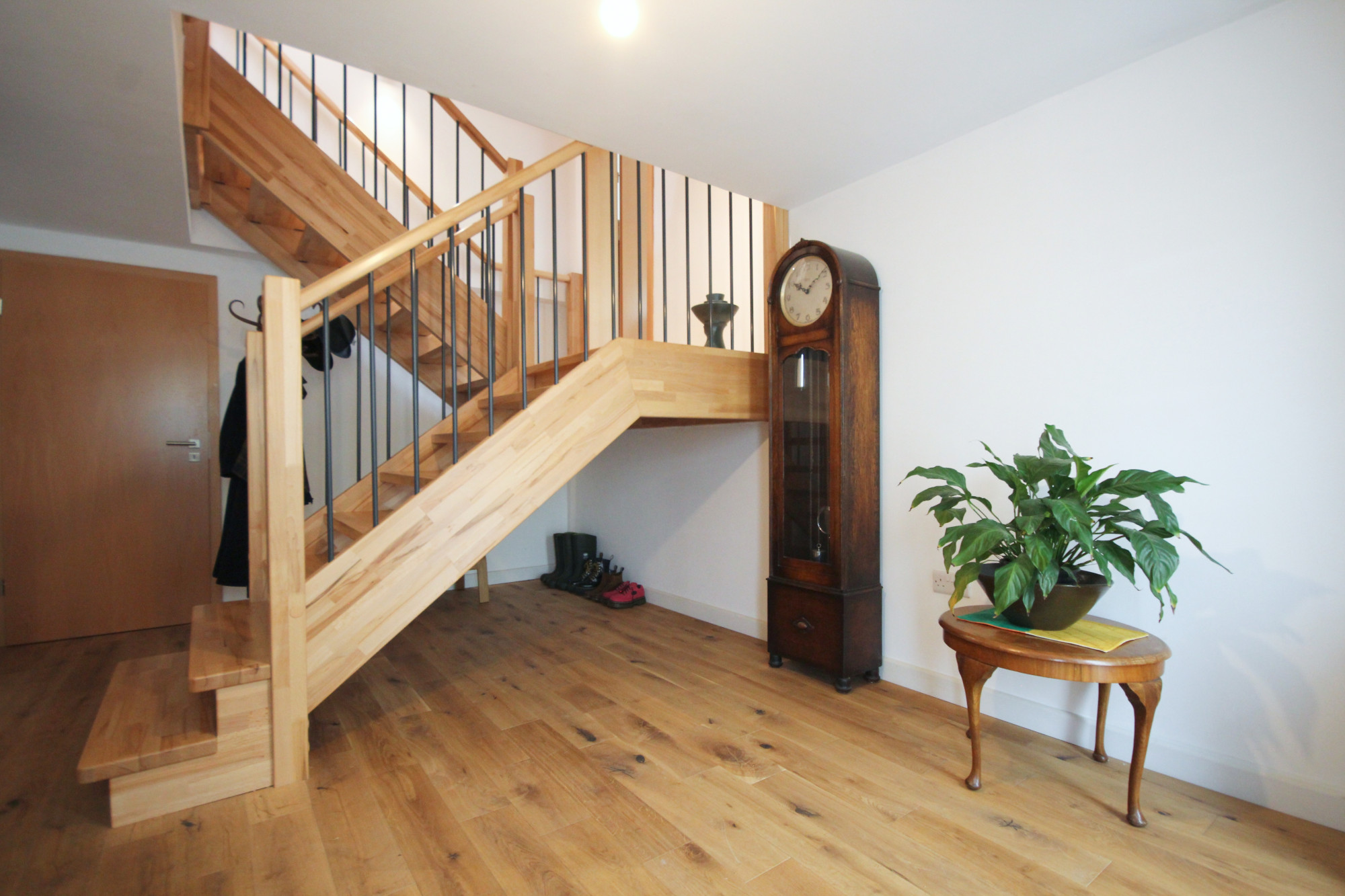 A sculptural series of open-tread beech staircases—both functional and visually stunning—guides you upward through the home. The upper ground floor reveals a maginficent living space: a large, light-filled lounge centred around a stylish 'Dan Skan' wood-burning stove, with twin grand sliding doors that dissolve the boundary between inside and out, opening seamlessly onto the garden.